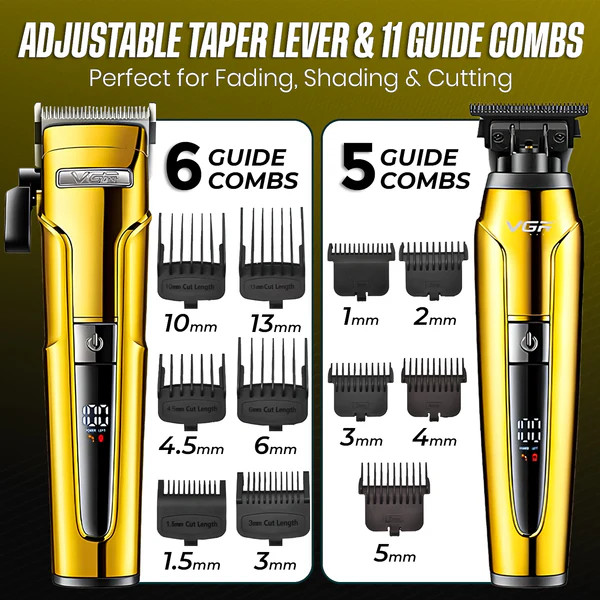 ست ماشین اصلاح وی جی آر مدل V-694 یک پک کامل و حرفهای برای اصلاح سر و صورت است که معمولاً شامل ماشین حجمزن (برش مستقیم) و خطزن دقیق میباشد. طراحی تیغهها بهصورت برش مستقیم (Straight Cut) باعث ایجاد اصلاحی صاف، یکنواخت و مناسب برای فید و سایهزنی میشود.