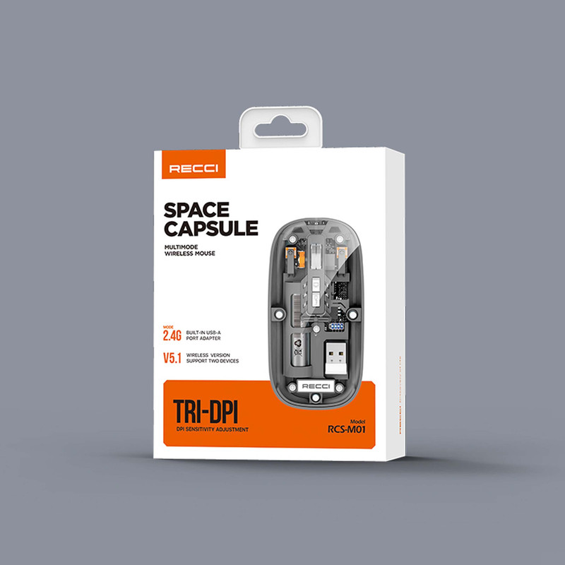 ماوس بیسیم Recci RCS-M01 از شرکت Recci یکی از مدلهای مدرن و جذاب در دسته ماوسهای بیسیم است. این مدل با طراحی شفاف / کپسولی «space capsule» و امکانات متعددی برای اتصال چندگانه ارائه میشود.